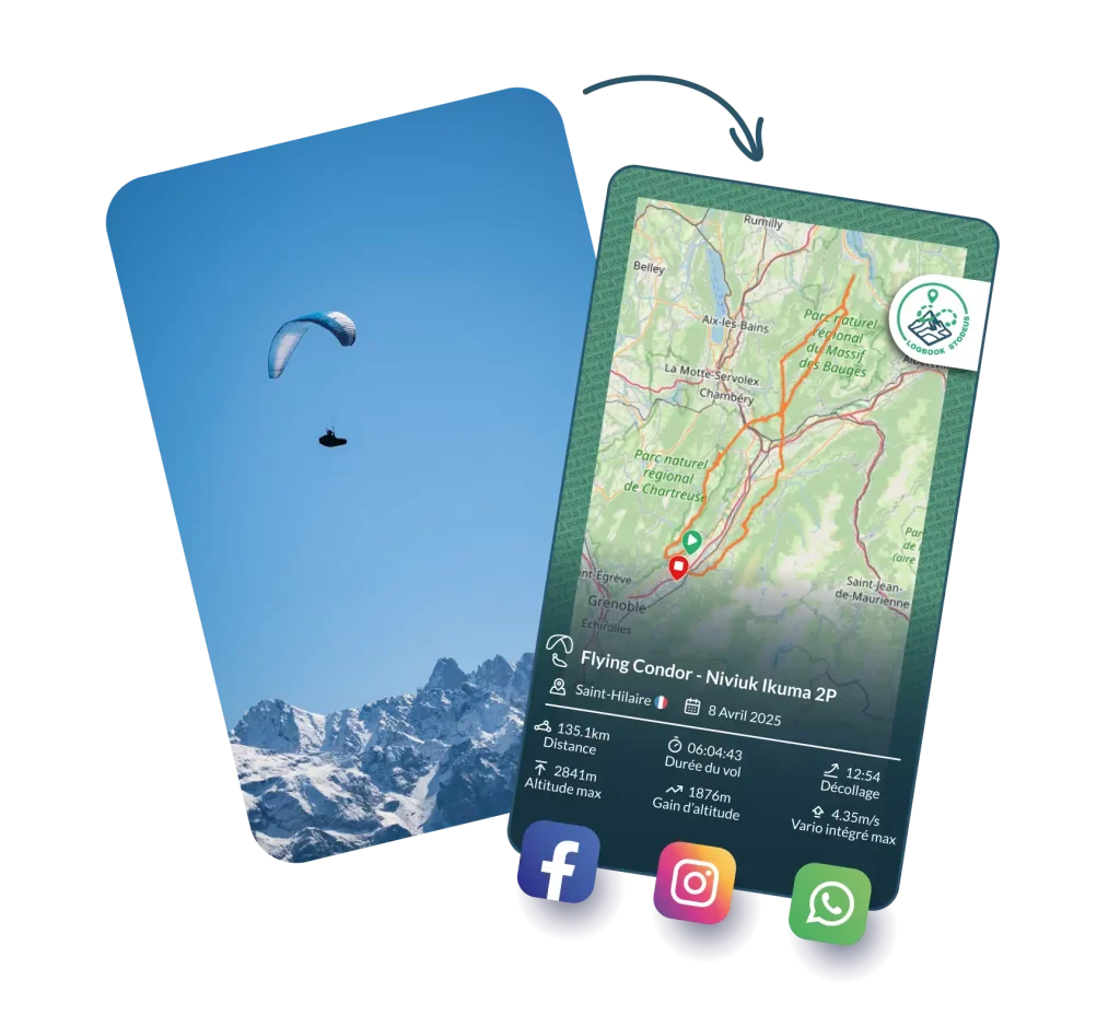 Al aterrizar, ver tu pista, explorar tus estadísticas y compartir tus mejores vuelos. También registra automáticamente tus horas de vuelo para ayudarte a controlar el desgaste de tus velas.