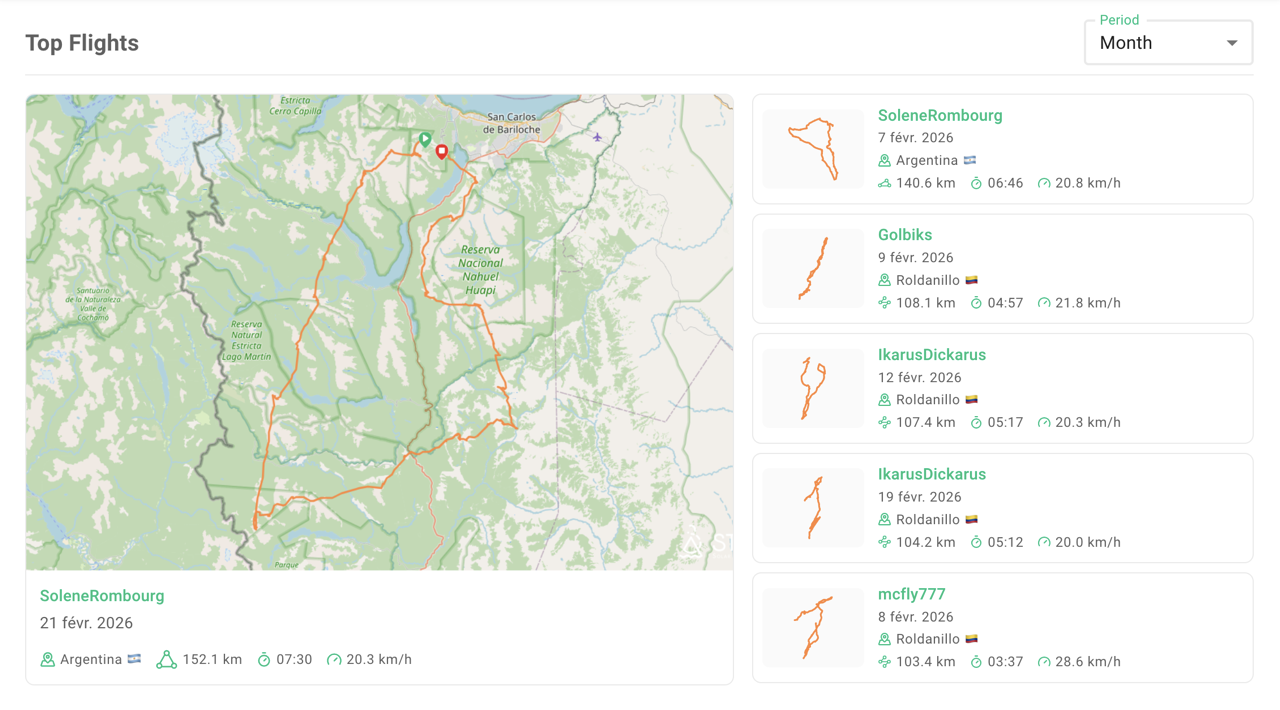 Parcourez les vols publics des autres pilotes et analysez leurs traces à travers le classement du Sommet. Une occasion d’observer les parcours, les choix de transitions ou les zones d’ascendance qui ont fait la différence.