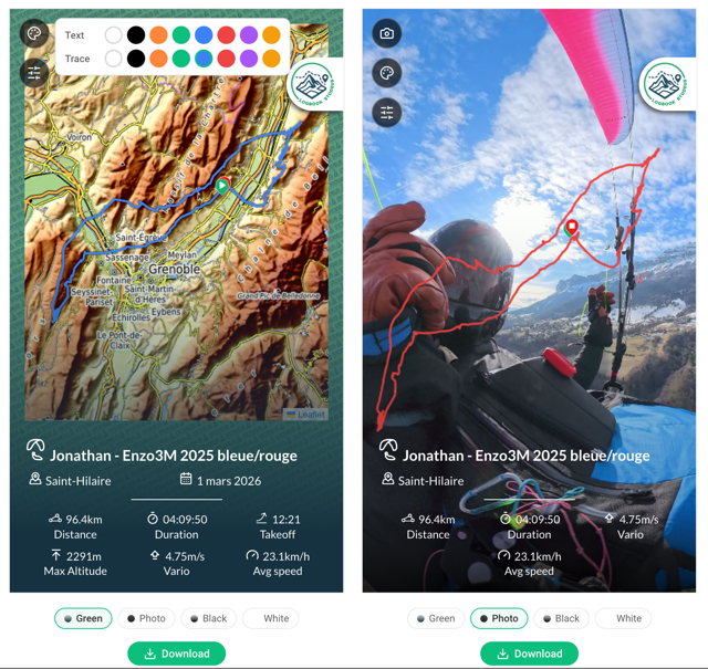 Personnalisez la couleur de la trace, du texte et du fond, ajoutez la plus belle photo prise pendant le vol… et partagez immédiatement votre dernière aventure.