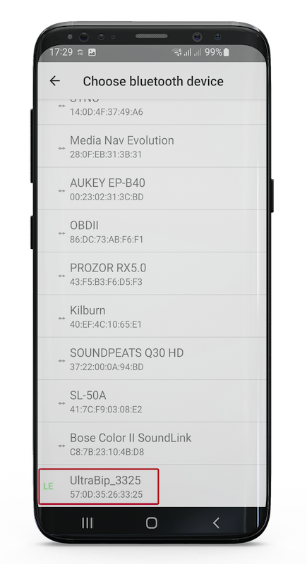 5. L'UltraBip / BlueBip appare nell'elenco degli altri dispositivi Bluetooth presenti nelle vicinanze. Selezionate il vostro strumento (ha un numero unico).
