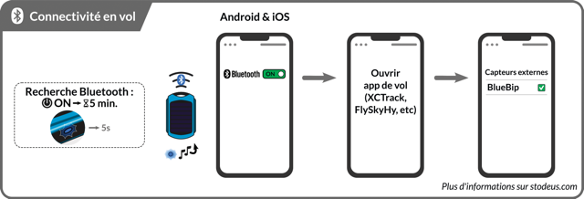 Łączność podczas lotu: BlueBip łączy się przez Bluetooth z ulubioną aplikacją lotniczą na Androida i iPhone'a (XCTrack, FlySkyHy, FlyMe, SeeYou Navigator, LK8000 i inne).