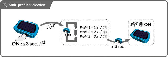 ON : Aby włączyć BlueBip, naciśnij i przytrzymaj przycisk przez 3 sekundy. Usłyszysz melodię startową, a następnie poziom naładowania baterii.