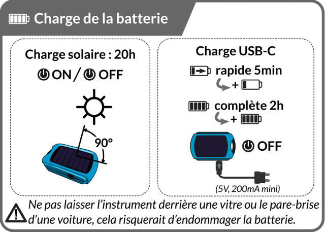 BlueBip zawsze ładuje się, gdy znajduje się w słońcu (niezależnie od tego, czy jest wyłączony, czy włączony)! Ładowanie słoneczne nie jest sygnalizowane, aby oszczędzać energię baterii. Należy odczekać około 20 godzin bezpośrednie światło słoneczne aby załadować go do 70%.