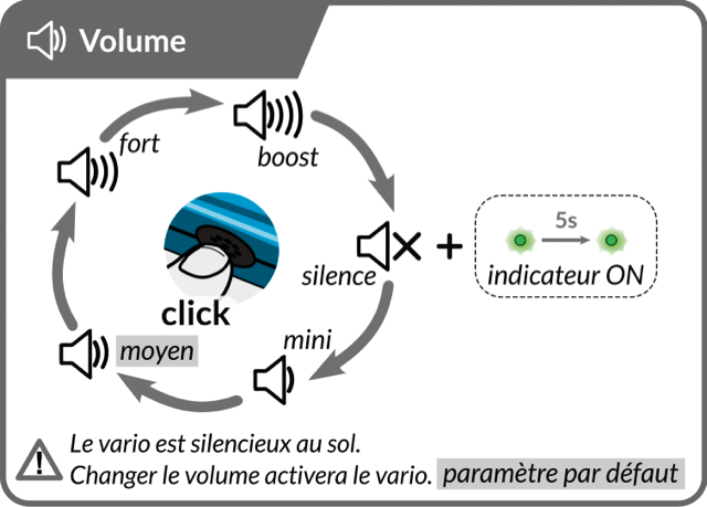 Vario jest domyślnie cicho na ziemi: musisz wystartować, aby aktywować vario (zmiana powyżej 1,5m/s).